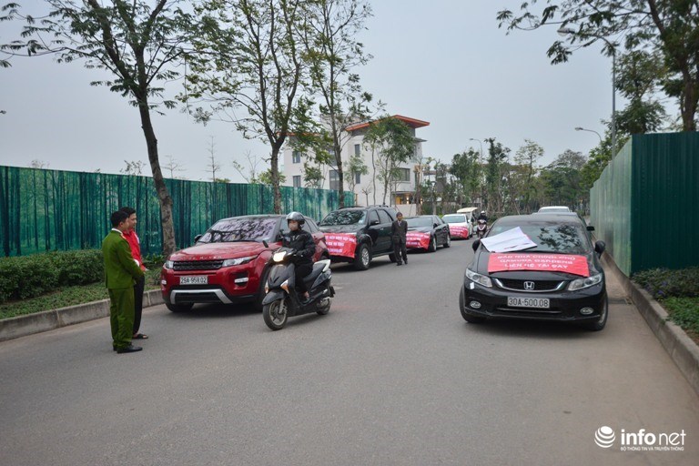Đã kiến nghị với chủ đầu tư nhưng tình trạng này chưa được giải quyết dứt điểm, chiều 1/3, các cư dân biệt thự, liền kề dàn ô tô, treo băng rôn để phản đối chủ đầu tư và trực tiếp đứng ra giám sát, không cho phép các cư dân chung cư đi vào lối đi riêng này.